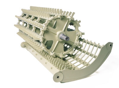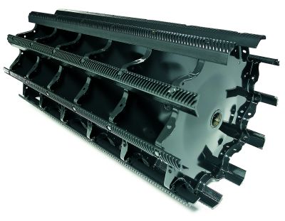 کوبنده نبشی دار:در این طرح نبشی هایی با الگوی مارپیچی روی بشقاب ها مونتاژ می شوند. شفت محرک ، بشقاب ها را می گرداند. ضد کوبنده نیز دارای تعدادی نبشی است. نبشی های کوبنده و ضد کوبنده هر دو دارای روکش لاستیکی هستند.عمل کوبیدن به آرامی انجام می شود.این طرح برای کوبیدن محصولات ریز دانه ، از قبیل شبدر و یونجه مناسب است.